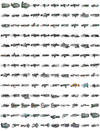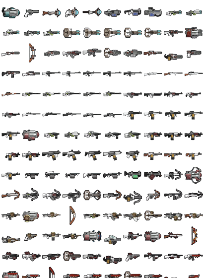 Weaponarrie — Weapons Pack is a 2D pixel-art weapon sprite pack for top-down / side-view games.